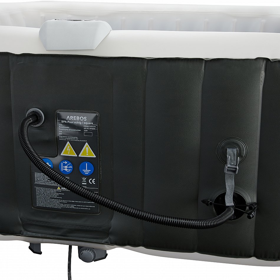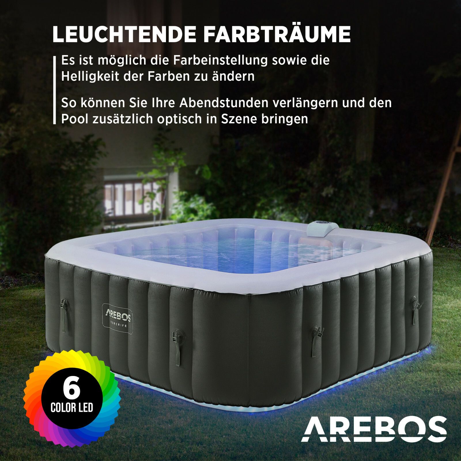 Erleben Sie luxuriöse Entspannung mit dem AREBOS Spa Pool Whirlpool. Dieser elegante Whirlpool ist ideal für den Innen- und Außenbereich und bietet Platz für bis zu 6 Personen. Genießen Sie die stimmungsvolle LED-Beleuchtung, die über eine Fernbedienung in verschiedenen Farben und Modi eingestellt werden kann, um die perfekte Atmosphäre zu schaffen.