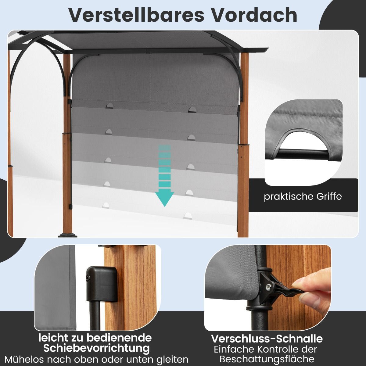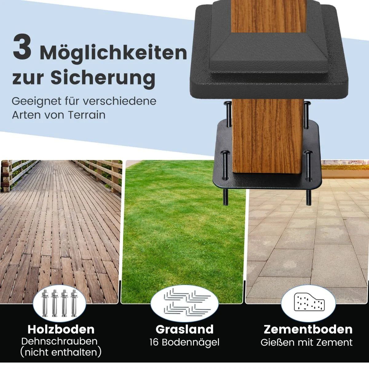 Dank der stabilen Konstruktion aus pulverbeschichtetem Metall und der verstärkten dreieckigen Struktur ist die Pergola besonders stabil und winterfest. Die vier großen Quadratfüße ermöglichen eine einfache Verankerung auf verschiedenen Untergründen, sei es Gras oder Holz, und bieten zusätzliche Sicherheit durch die mitgelieferten Bodennägel. Darüber hinaus fügt sich das elegante Design mit holzähnlichen Metallpfosten harmonisch in jede Gartenlandschaft ein und verleiht Ihrem Außenbereich eine ansprechende Note.