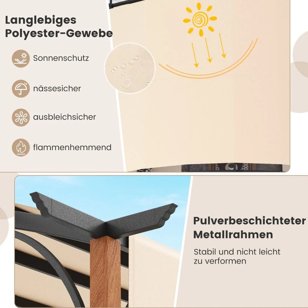 Der 3,6 x 3 m große Pergola mit ausziehbarem Dach ist die perfekte Lösung, um Ihren Außenbereich stilvoll zu gestalten und gleichzeitig optimalen Schatten zu bieten. Mit einem robusten und langlebigen Polyesterstoff-Baldachin, der sowohl spritzwasserfest als auch UV-beständig ist, können Sie unbesorgt Zeit im Freien verbringen. Die Pergola lässt sich mühelos an Ihre Bedürfnisse anpassen, indem Sie den Baldachin einfach an den praktischen Griffen ziehen und in der gewünschten Position verriegeln. Sie eignet sich ideal für verschiedene Anlässe, sei es für BBQs, Picknicks oder gesellige Zusammenkünfte mit Freunden und Familie.